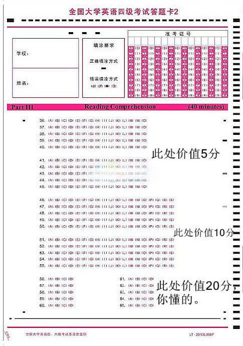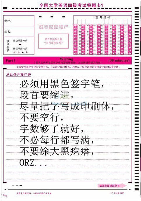 即将要走上四六级考场的各位亲,提前看一眼答题卡还是很有必要的,下面为大家整理了英语四级考试答题卡,同学们一定要注意要求,了解各题型所在位置以及排列的顺序,谨防填串行。听力需要边听,边做题,还要边填机读卡,真是难为你们了。同学们考试加油啊!!!