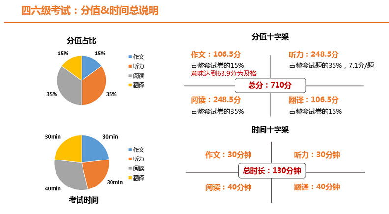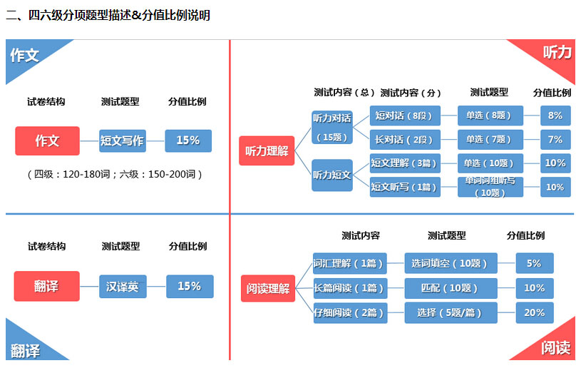 距离2015年12月 英语四六级考试只有两天了,同学们是不是都在紧张复习中呢?然而,光知道复习不知道四六级考试卷的基本构成怎么行呢?通过平时练习真题,同学们肯定都知道 四六级试卷分为四大题型:听力理解;阅读理解;完型填空;写作和翻译。但是你们知道四六级的分值占比和时间吗?下面小编就来图文结合进行解说啦~