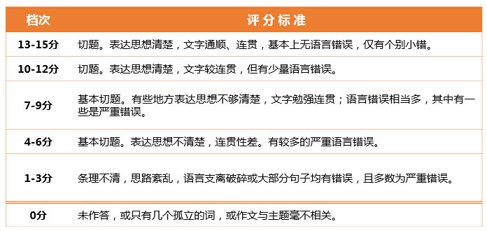 本题满分为15分,成绩分为六个档次:13-15分、10-12分、7-9分、4-6分、1-3分和0分。